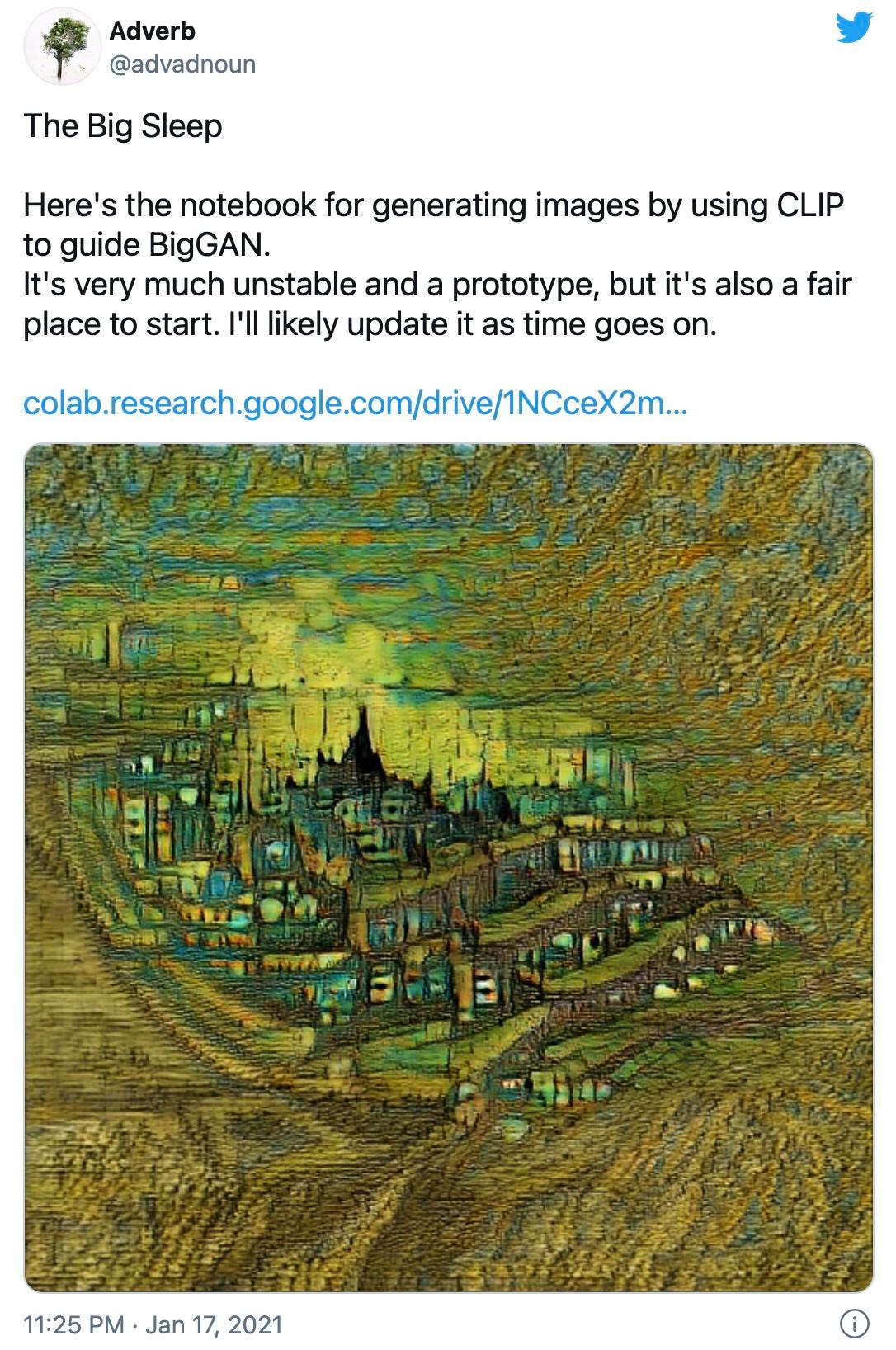 In just a couple weeks, there was a breakthrough. @advadnoun released code for The Big Sleep: a CLIP based text-to-image technique, which used Big GAN as the generative model.