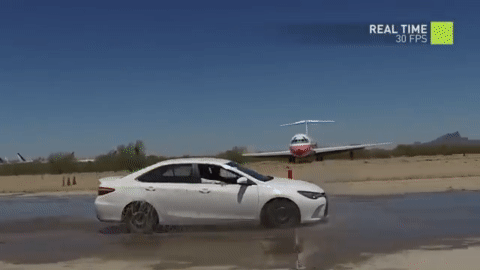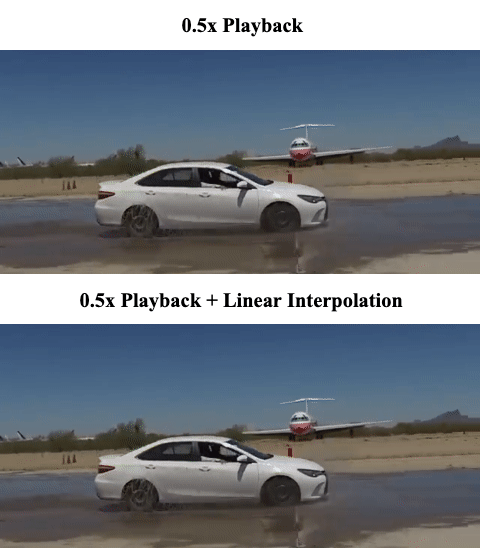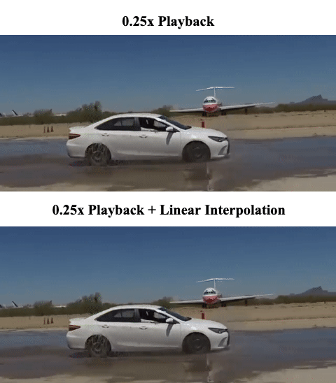 This model is optimized and evaluated with the aid of high definition videos. Certain frames of high speed recordings are concealed and the model is asked to recreate them using frame interpolation. The model is evaluated on it’s ability to predict frames with pixel values similar to the concealed ones. Additionally, there are metrics that capture how realistic and smooth the interpolated frames are. The bottom line is that there are many different, important metrics to consider and Super SloMo performs competitively in all of them. Here’s the car example from before slowed down using Super SloMo:
