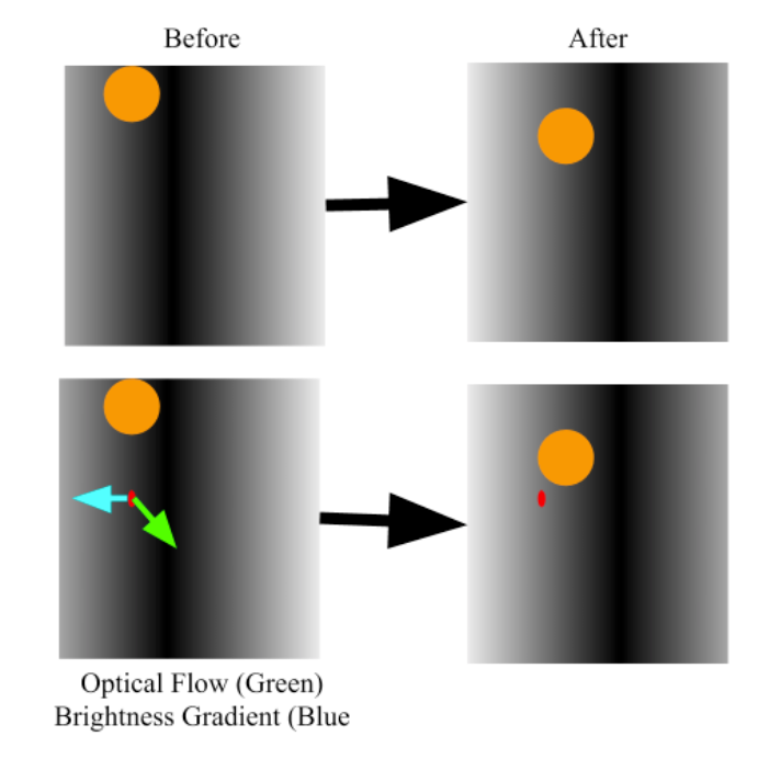 Traditionally we assume that an object won’t move by more than a few pixels between frames. For a target position, such a method would consider the neighboring locations in the second frame and locate where the original pixel’s color went. A more concrete example is as follows. Suppose originally a target position is bright red, but has different color in the second frame. We’d look in the vicinity of the target position and identify the closest pixel that is roughly bright red. Then we’d claim the optical flow for the target position as the displacement to that new bright red location. For example: