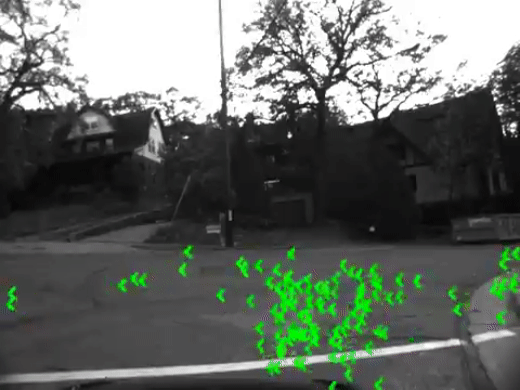 A more realistic, complex example is shown below. Once again notice how optical flow vectors arise around boundaries of motion. Further notice how the optical flow vectors point opposite to the car’s direction. While the car is moving forward, everything visible in the frame is moving backwards.