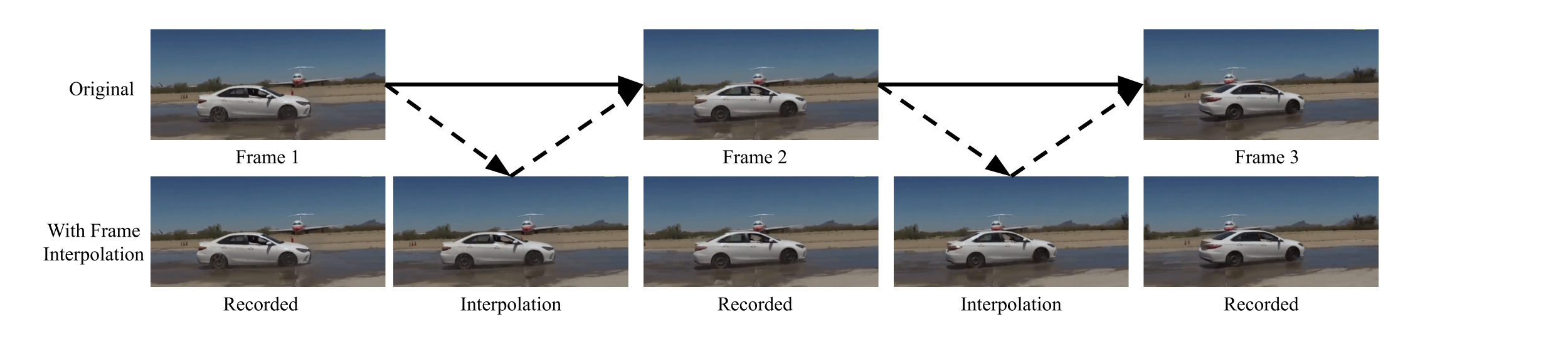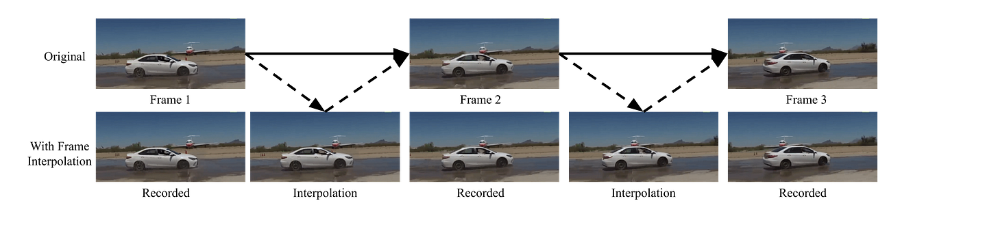 The above attempts to slow down the original video by a factor of only 2, but immediately we observe the same issue that presented itself in the circle problem. Pixel-wise linear interpolation yields two “half cars”, one where the car was in the first frame and one for where it was in the second frame, instead of one car in the right spot. This problem is exacerbated due to the moving point of view. If we were to try to slow down the original video by a larger factor say 4, the result is even worse: