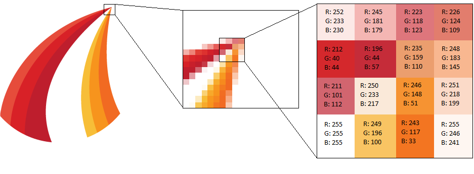 Below is a visual example. First we zoom into a small portion of the image to observe the presence of constant color pixels. Then we take a look at the R(ed)G(reen)B(lue) components of each pixel. Zooming back out we can represent the whole image as a matrix where each entry has the RGB values for the corresponding pixel.