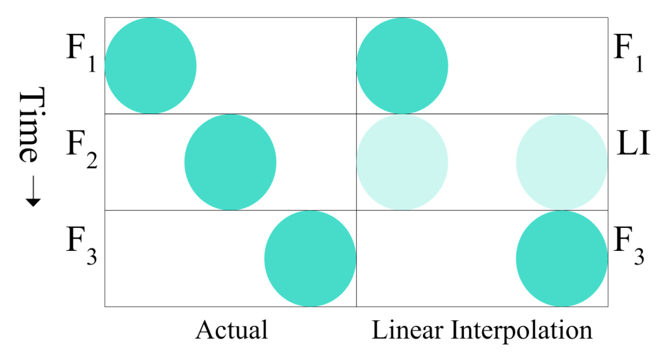 We use pixel-wise linear interpolation between the two frames we have, to generate the frame labeled “LI” (Linear Interpolation) which aims to predict the missing frame, F2. Remember that in its most basic form linear interpolation does not actually locate objects and their motion, rather it simply averages pixels. The circle in F1 averages with the white space that occupies the same spot in F3, and similarly for the circle in F3 with the white space in F1. This results in two “half” circles where the circle starts and finishes, and no sign of the circle where it actually is at the target time. Since linear interpolation struggles in this simple circle-tracking scenario, it is no surprise that it also struggles with real-world video.